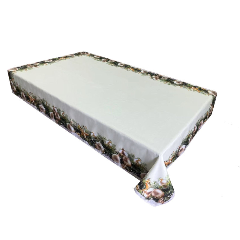 Dizainas: Staltiesė puošta tradiciniais Kalėdų motyvais, tokiomis kaip eglutės, žvaigždės ir Sniego seniai, kurie sukuria jaukią ir šiltą atmosferą.